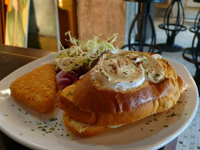 芝士三文治因為焗製需時,說明是要等上15分鐘才有得吃的。送上來果然是烘得香味四溢。用上三款芝士去製作,分別是羊奶芝士、藍芝士及牛奶芝士gruyere,羊奶芝士的羶勁,加上藍芝士的霸道香味,gruyere的綿滑口感及鹹香,芝士迷絕對不容錯過,值得推薦的。伴碟還有沙律菜及炸薯餅,吃得飽飽的,下次一定要試試這裡的croque-monsieur。