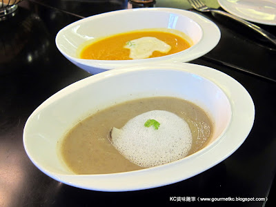 二十道菜怎樣試菜?我們唯有將責任交給Mike,就由他在每個項目中選幾款來試試。只見他走回廚房準備,而這裡是採用半開放式設計,客人坐在位中是可以看到廚師在工作之餘也可以立即給予意見。先來的是兩味湯,相比起甜美的甘筍湯,濃郁、幼滑又香味十足的蘑菇湯就更得我心。特別在寒冷的天氣喝此品,暖在心。