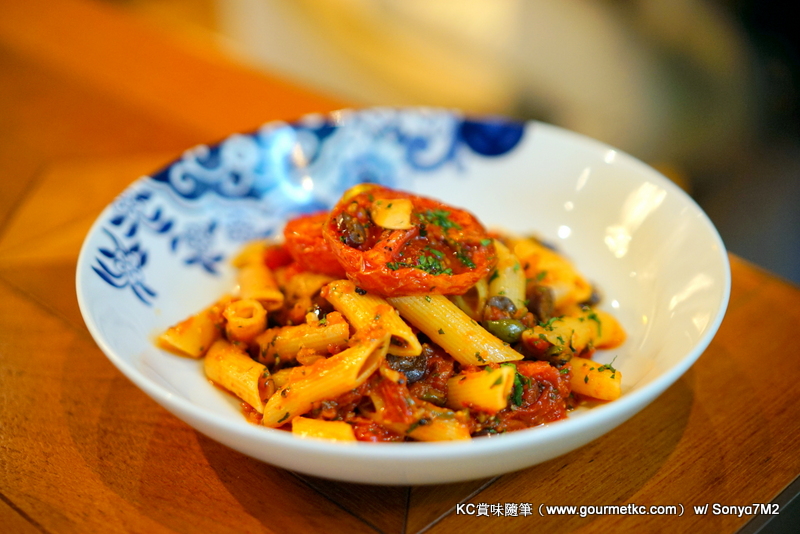 三文魚一向不是我的選擇,因為個人而言不吃生三文魚,而此品煮熟了又很少會好吃。是日拿來的是蒸的,肉質軟嫩而毫不乾身,也做得好,配上墊底的新薯同吃也不錯。Penne Puttanesca是Spathetti alla Puttanesca的變奏吧,鹹香而辛辣的味道也做得正宗。